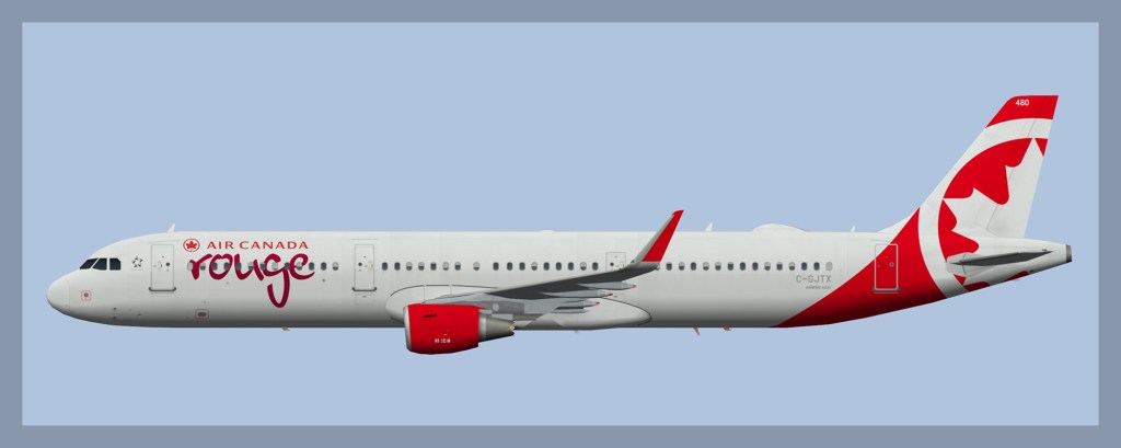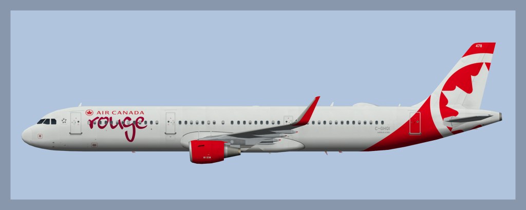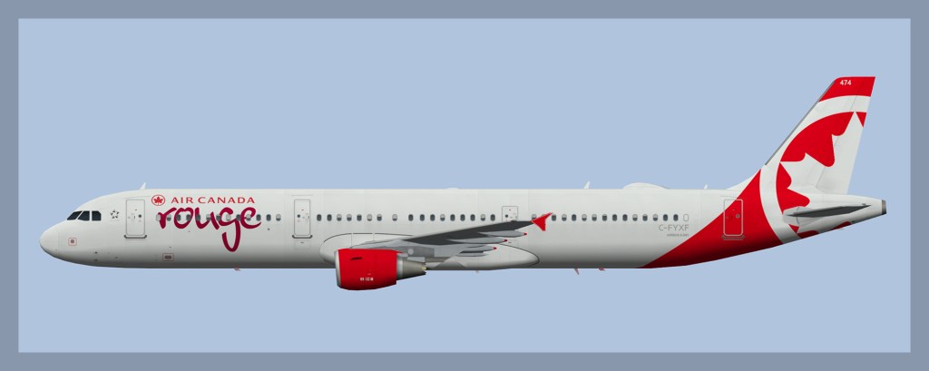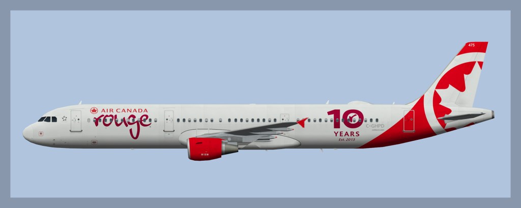 Paint for the FAIB Airbus A321 model in Air Canada Rouge livery. C-GHPD no longer wears 10 year anniversary titles and now features larger Air Canada titles.