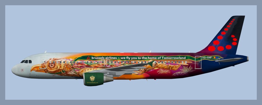 Features Brussels Airlines repaint for the FAIB A320. This aircraft wears a livery promoting the Tomorrowland electronic dance music festival, which his held annually since 2005 in Boom, Belgium