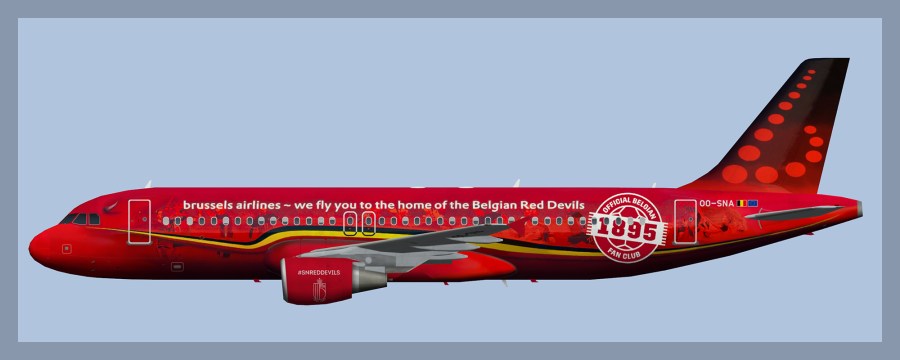Features Brussels Airlines repaint for the FAIB A320. This aircraft wears a livery promoting the Belgium national football team, known as the Red Devils