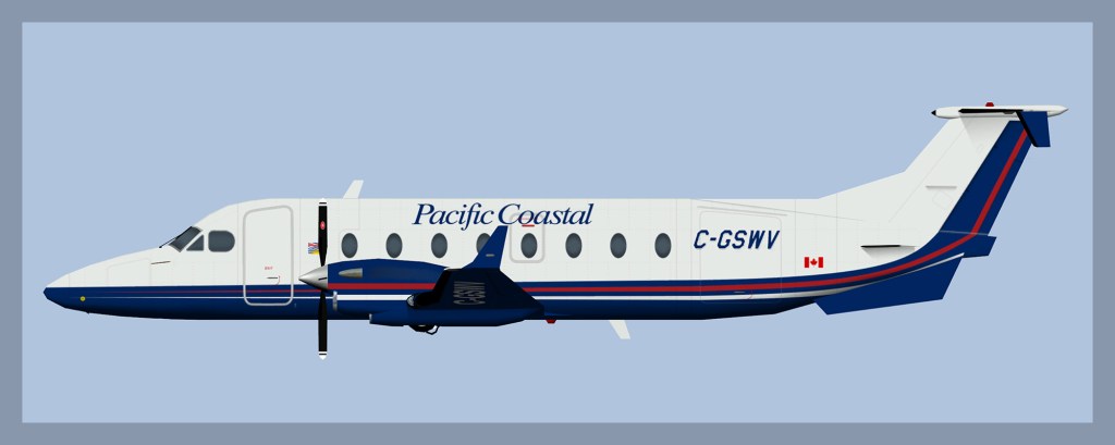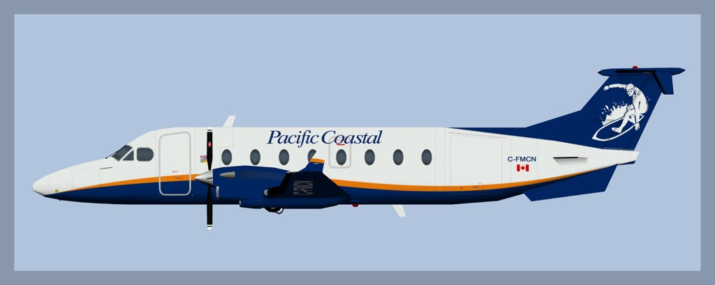Paints for the HTAI Beech 1900D model in Pacific Coastal livery. Each aircraft features a different tail design. One aircraft wears a hybrid Sunwest livery and another has an all white overall livery.