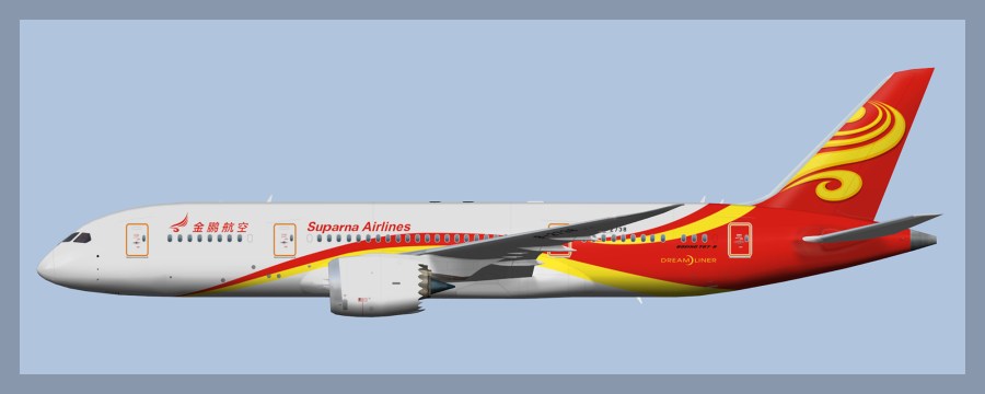 Features Suparna Airlines repaint for the FSP Boeing 787-8. Suparna Airlines recently received its first 787 from parent Hainan. Suparna Airlines is the re branded Yangtze River Airlines which used to be a mainly Cargo airline in China and is part of the massive Hainan Group.