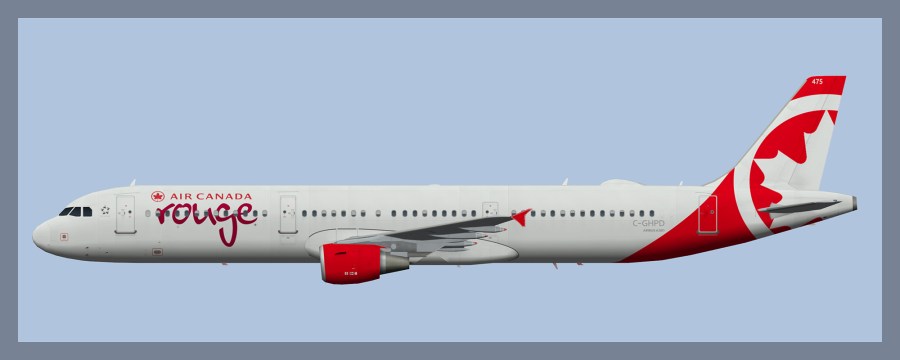 Paint for the FAIB Airbus A321 model in Air Canada Rouge livery. C-GHPD no longer wears 10 year anniversary titles and now features larger Air Canada titles.
