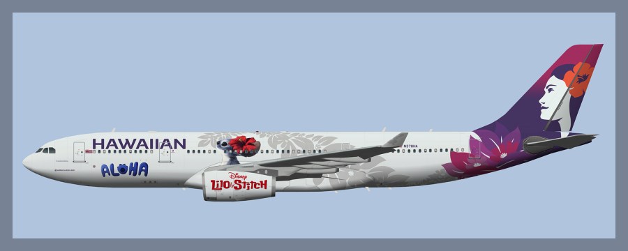 Paint for the AIG Airbus A330-200 model in Hawaiian Airlines livery. Features special markings for Disney’s Lilo and Stitch live action movie.