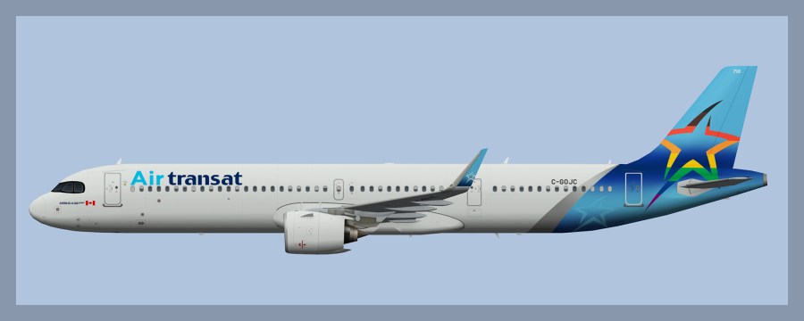 Paints for the FAIB Airbus A321NEO model in Air Transat livery. C-GOJC has been wearing this Pride tail during June.